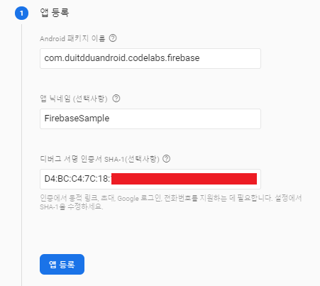 여기까지 잘 따라왔으면 위와 유사하게 입력되어 있을 것이다. "앱 등록" 을 눌러 다음단계로 간다.