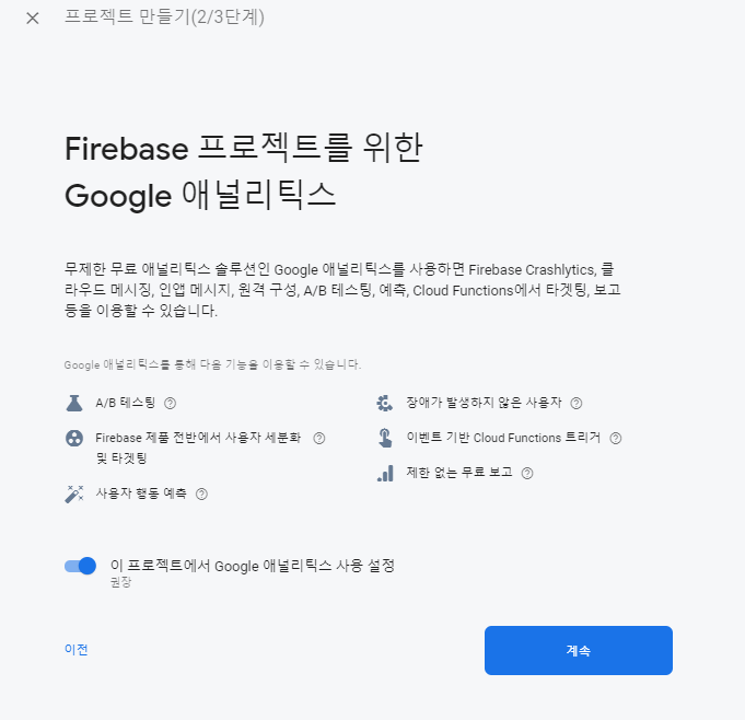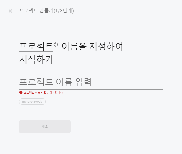 처음으로 보게 될 화면이다. 생성하고자 하는 프로젝트의 이름을 입력하면 "계속" 버튼이 활성화 될 것이다.