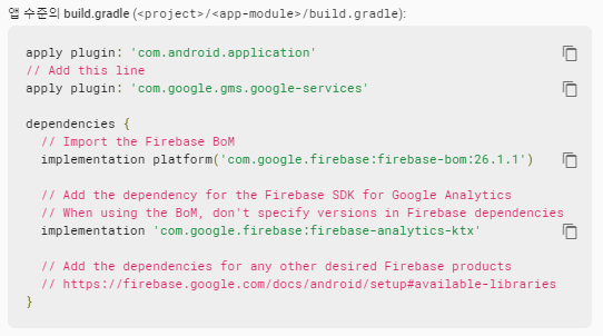 dependencies에 "com.google.firebase:firebase-analytics-ktx", "com.google.firebase:firebase-analytics-ktx" 를 추가하자.