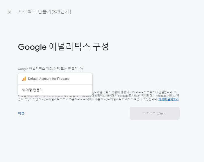 큰 어려움 없이 마지막 단계까지 왔다. 아마 Default Account for Firebase가 있을텐데, 이 계정을 선택해도 좋다.