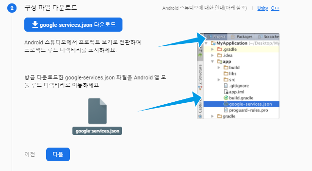 그리고 안드로이드 프로젝트의 app 폴더 안에 넣자. 이 파일 위치를 잘못 넣어 연동이 안되는 경우가 많으니, 주의하자.