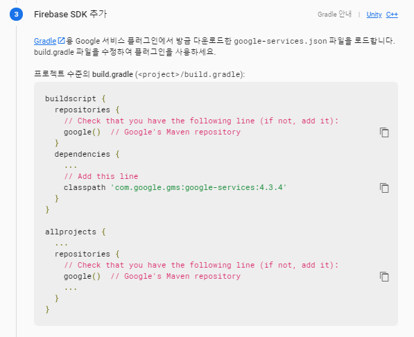 이제 프로젝트 수준의 build.gradle로 이동하여 "com.google.gms:google-services:4.3.4'" 를 추가해주자.