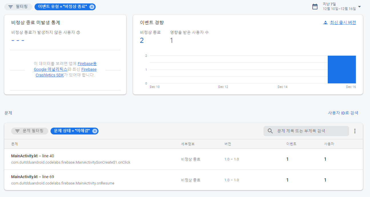 이제 Crashlytics를 연동하고 비정상 종료를 해 보자.