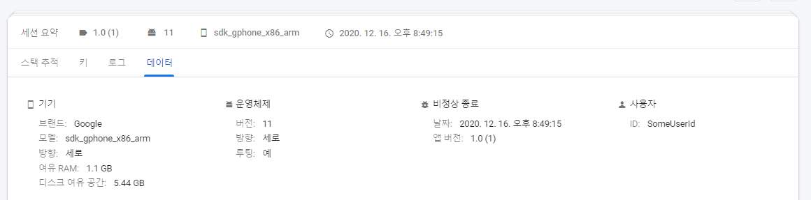 리포트 된 크래쉬에서 키, 로그, 데이터 부분에서 직접 삽입한 내용을 확인할 수 있다.