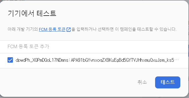 콘솔상에서 특정 기기의 토큰을 사용하려면 "테스트 메시지 전송" 에서만 가능하다. 눌러보자.