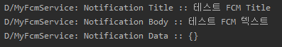 Data는 비어있을텐데, 이는 FCM을 전송할 때 서버측에서 JSON 형태의 데이터를 넘겨주는 등이 필요하다.