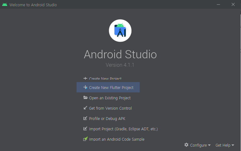 설치가 완료되고 나서 Android Studio를 재실행하면, "Create New Flutter Project" 항목이 보일 것이다. 선택하여 프로젝트를 생성하자.