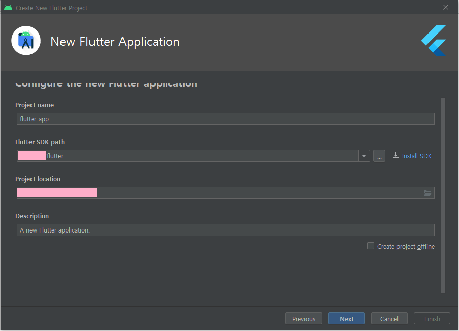 Flutter SDK path는 1번 단계에서 설치했던 SDK 경로를 찾아주어야 한다. 문제가 없다면 "Next"를 할 수 있다.