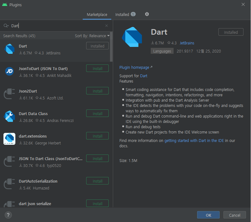 우선 Flutter, Dart 플러그인을 Android Stuido에 설치해야 한다. Android Studio를 실행하고, Plugins를 열고 Flutter, Dart를 검색하여 설치한다. 위 스크린샷은 이미 설치 된 상황이라 Installed가 표시된다.