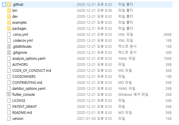 압축을 풀면 flutter 폴더 아래에 위와 같은 구성을 확인할 수 있다.