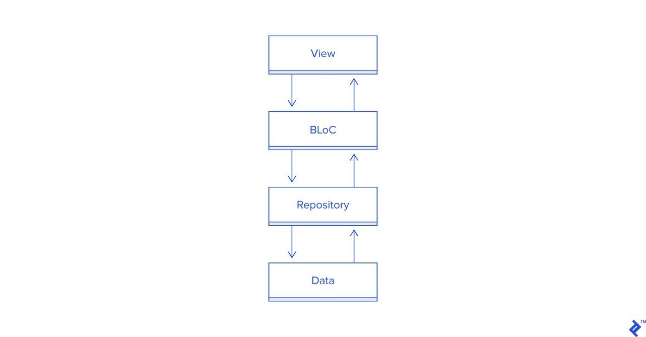 의존성을 보면 Widget은 BLoC를, BLoC는 Repository를, Repository는 Data를 참조한다.