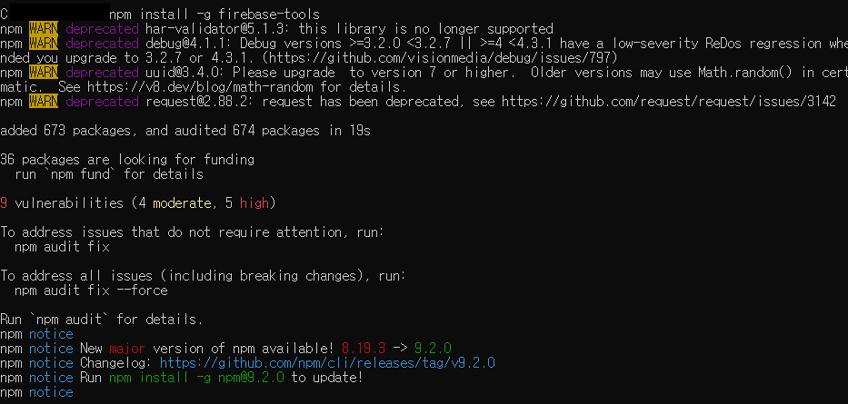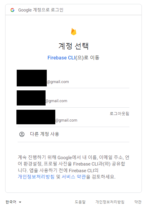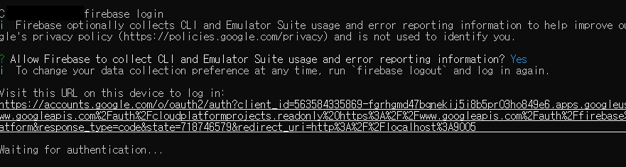 처음 설치했다면, 'firebase login' 명령어로 인증을 먼저 해 주어야 한다.