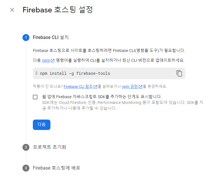 시작하기를 누르면 가장 먼저 Firebase CLI를 설치해야 한다.