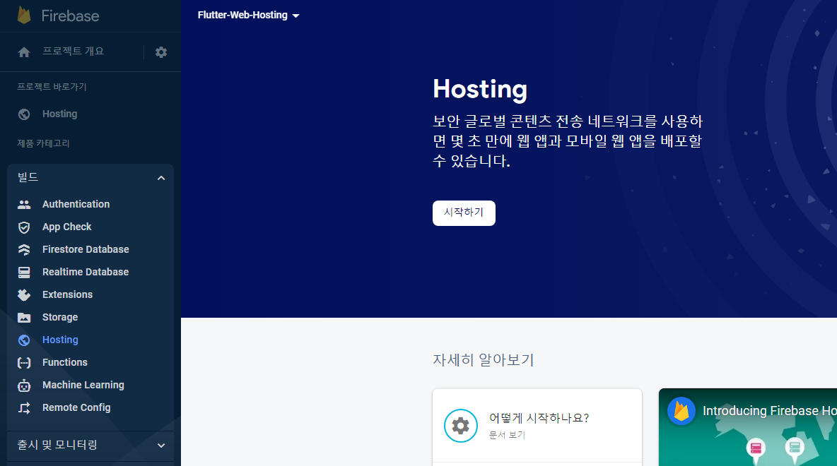프로젝트로 이동해서, 좌측 빌드 옵션의 Hosting으로 진입한다.
