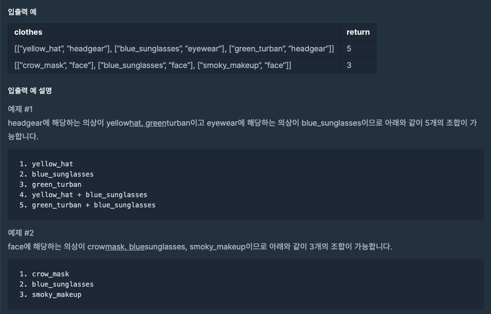 문제를 읽고 처음 입출력 예를 보고 나면 의상의 종류와 의상들을 묶어서 가능한 조합들을 모두 구하면 되겠다고 생각할 수 있다. 하지만 조금만 생각해보면 의상의 종류와 그 종류가 몇 개의 의상이 있는지만 알면 경우의 수를 구할 수 있다. 또한 같은 이름을 가진 의상이 존재하지 않기 때문에 별다른 예외처리도 필요 없음을 짐작할 수 있다.