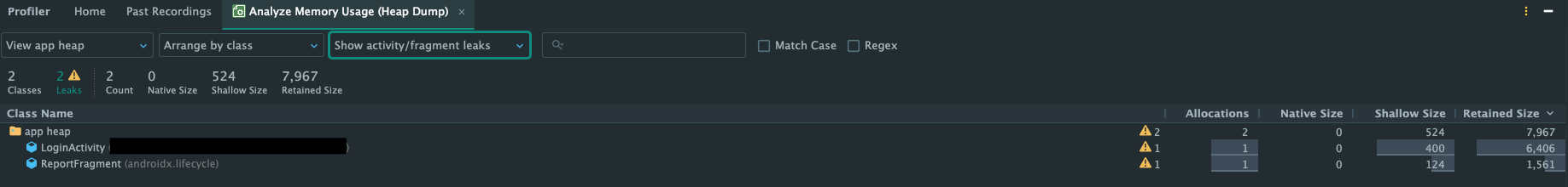현재 앱에서 사용한 모든 클래스에 대한 메모리 할당과 크기같은 것들을 확인할 수 있습니다. 보시면 노란색 경고 아이콘과 함께 숫자가 나타나 있는걸 볼 수 있는데, 저것이 메모리 누수를 나타냅니다.