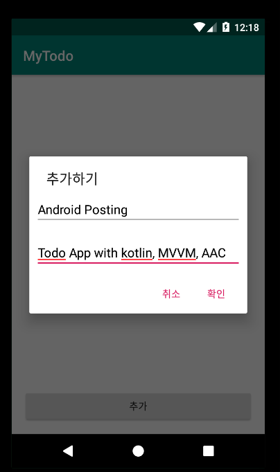 이 다이얼로그는 확인, 취소 버튼이 존재하고 확인버튼을 누르면 입력된 값과 현재시각을 활용하여 TodoModel을 만들고 어댑터에 추가한 뒤 갱신 함수를 호출 할 것이다.