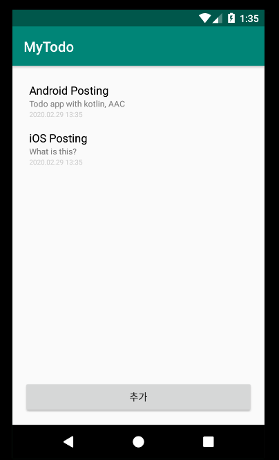 이전에 했던 작업과 동일하게 동작하며, 데이터베이스를 활용하기 때문에 앱을 종료했다 켜도 아이템들이 그대로 살아있는 것을 확인할 수 있다.