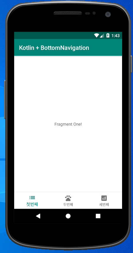 실행하면 위와 같이 첫번째 탭이 디폴트로 선택되어 있을 것이다. 두번째, 세번째 탭을 선택하면 프래그먼트가 변경 될 것이다.
