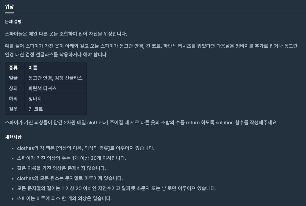 # 문제 # 문제 접근 문제를 읽고 처음 입출력 예를 보고 나면 의상의 종류와 의상들을 묶어서 가능한 조합들을 모두 구하면 되겠다고 생각할 수 있다. 하지만 조금만 생각해보면 의상의 종류와 그 종류가 몇 개의 의상이 있는지만 알면 경우의 수를 구할 수 있다. 또한 같은 이름을 가진 의상이 존재하지 않기 때문에 별다른 예외처리도 필요 없음을 짐작할 수 있다. 따라서 의상의 종류가 "키"가 되고 의상의 개수가 "값"이 되는 딕셔너리를 생성하여 문제를 풀 수 있을 것이다. # 문제 풀이 1. "의상의 종류 : 의상의 개수" 의 구조를 가진 딕셔너리를 생성한다. 2. clothes 리스트를 순회하며 딕셔너리에 저장한다. 3. 딕셔너리를 순회하며 경우의 수를 구하여 반환한다. 4. 경우의 수를 구하는 것은 수학적..